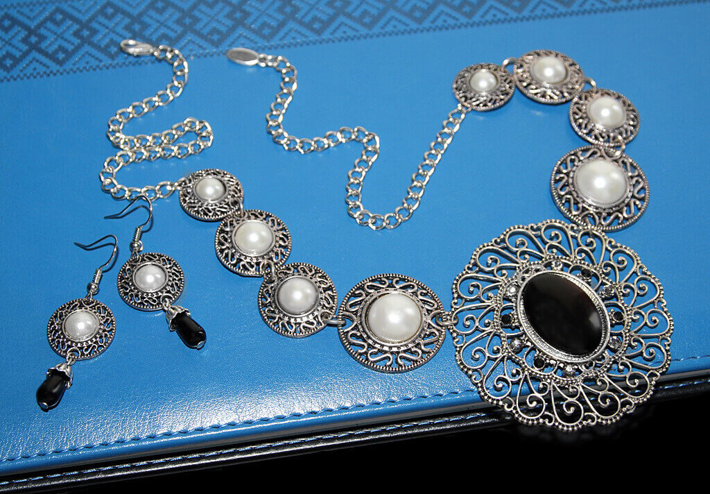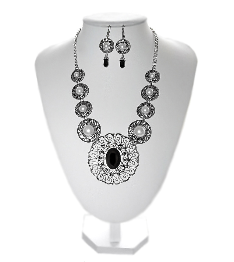 Erinevas suuruses ümmarguste vanahõbedavärvi metalldetailide, valgete pärlkameede ja suure pitsilise ripatsiga rahvuslikus stiilis kaelakee komplektis kõrvarõngastega.