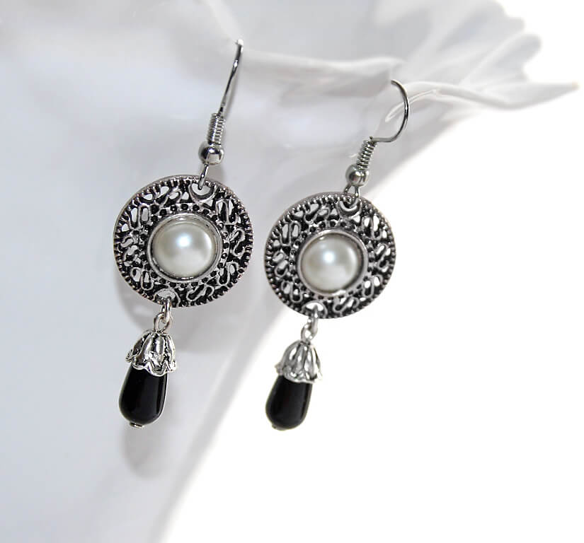 Komplekti kuuluvate väikeste mustade tilgakujuliste ripatsitega kõrvarõngaste pikkus koos konksuga on 5 cm.