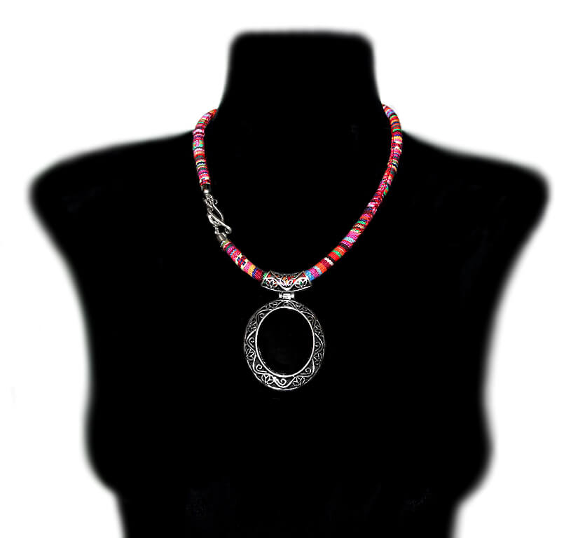 Triibukangast paela ja suure antiikhõbedases metallraamis kameeripatsiga rahvuslikus stiilis kaelaehe.
