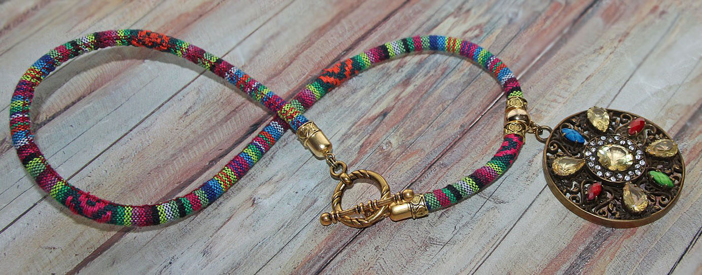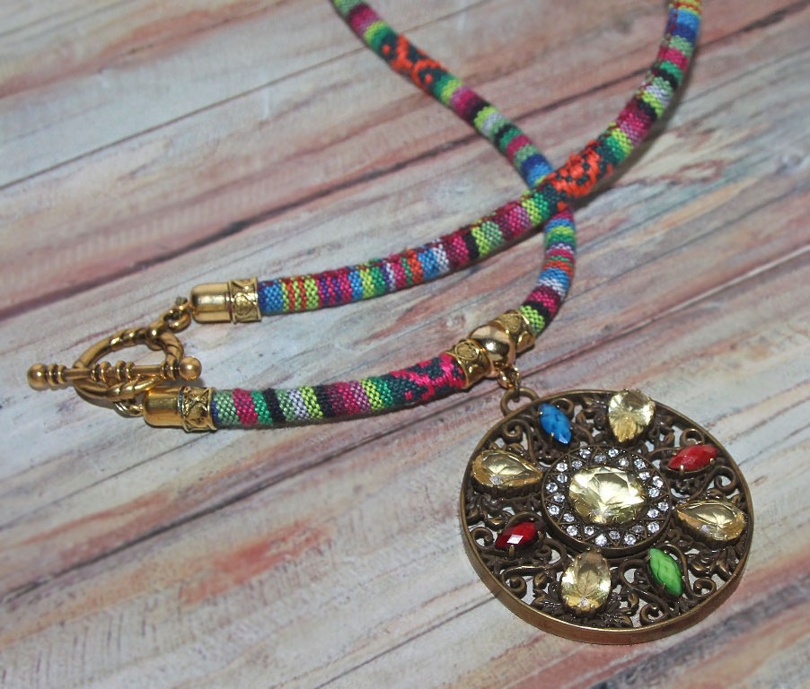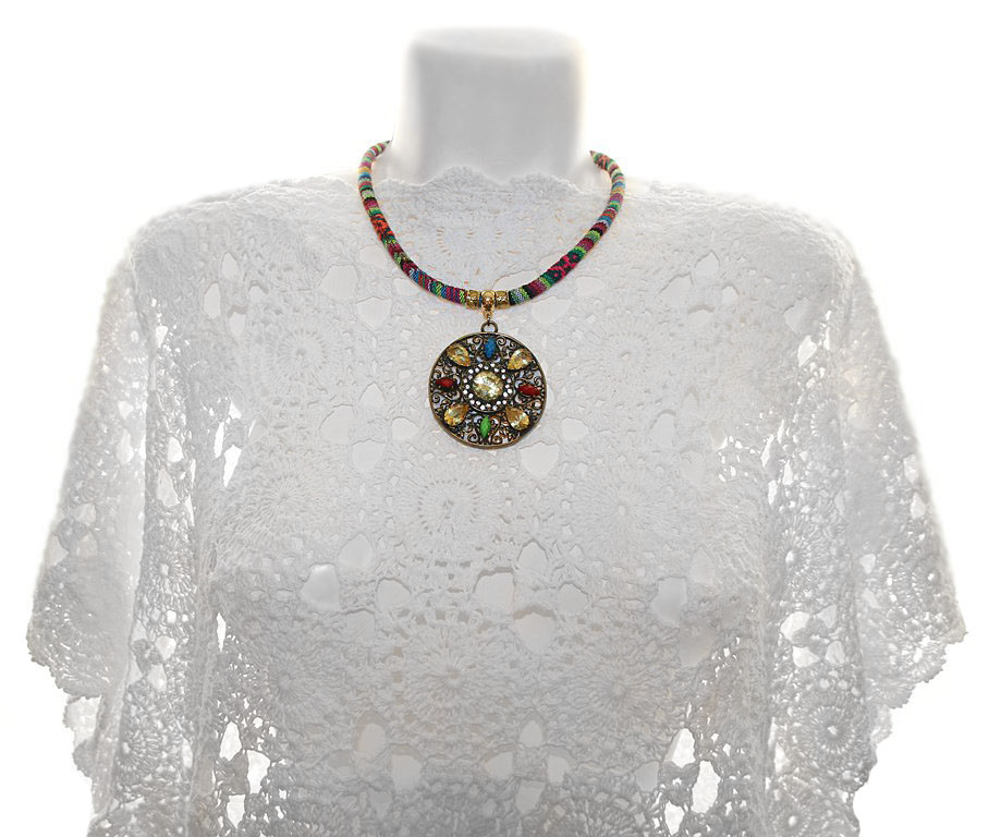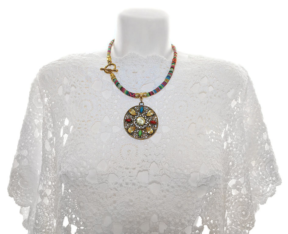 Triibukangast paela ja suure ümmarguse, antiik-kuldset värvi pitsilise metallripatsiga rahvuslikus stiilis kaelaehe.
