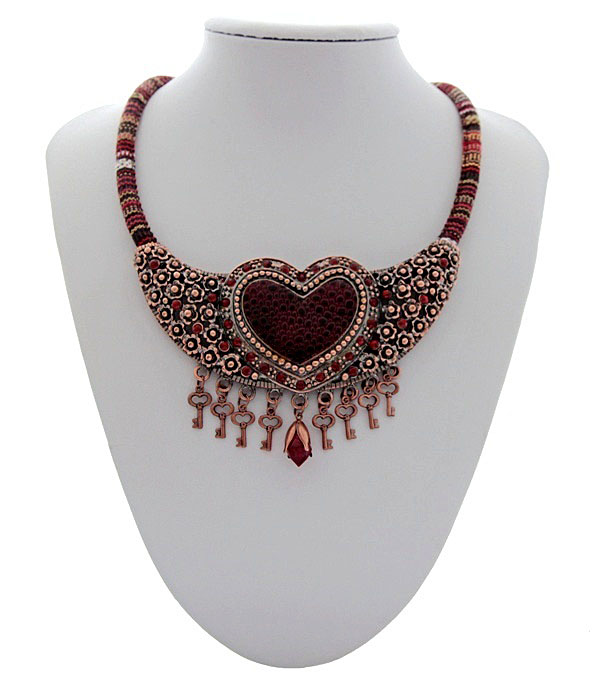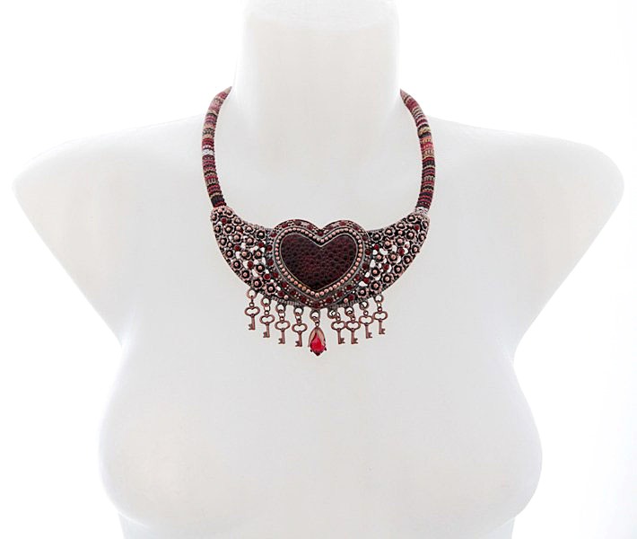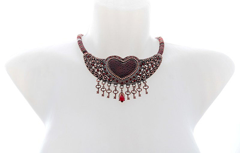 Rahvuslikel ainetel kaelaehe triibukangast paela, võtmekujuliste ripatsite ja suure vasevärvi metalldetailiga