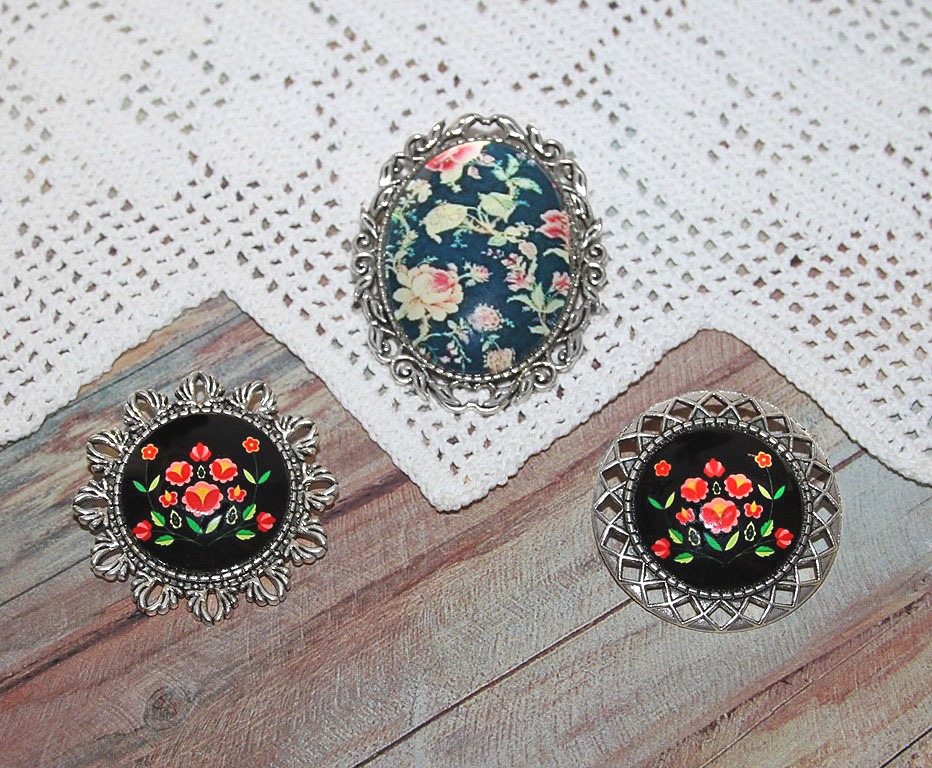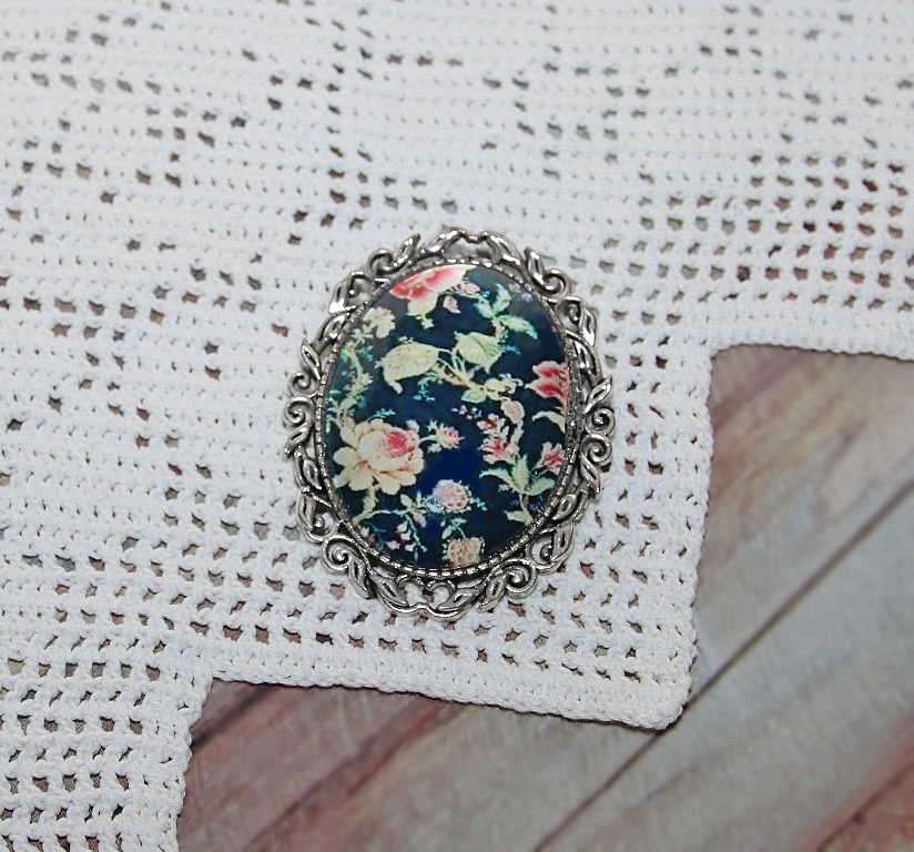 Rahvuslikus stiilis lilltikandi motiiviga kamee mõõdud on 3 cm x 4 cm.