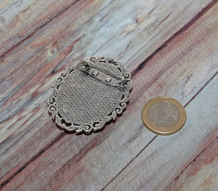 Väikeste oksakeste ja lehekestega kaunistatud antiikhõbedavärvi pitsilise metallraami ja suure ovaalse klaaskameega pross.