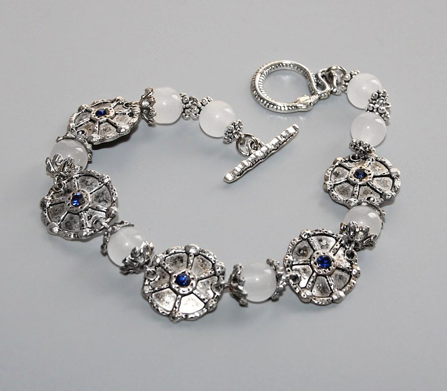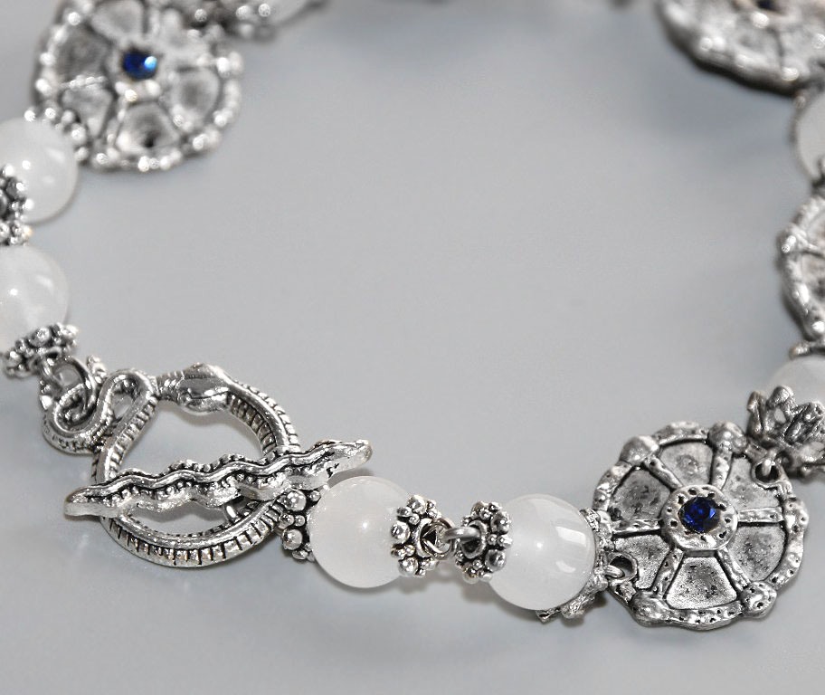 Kaunilt kumavate piimjas-valgete kuukivihelmeste ja rahvuslikus stiilis metalldetailidega käevõru ussikujulise T-kinnisega.