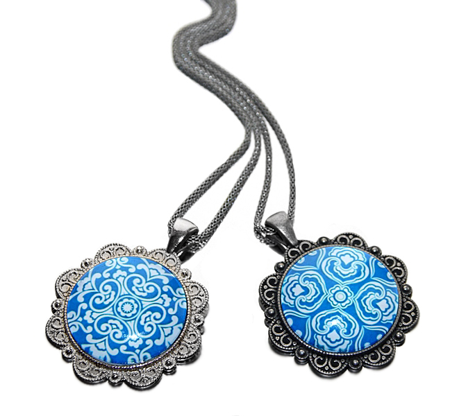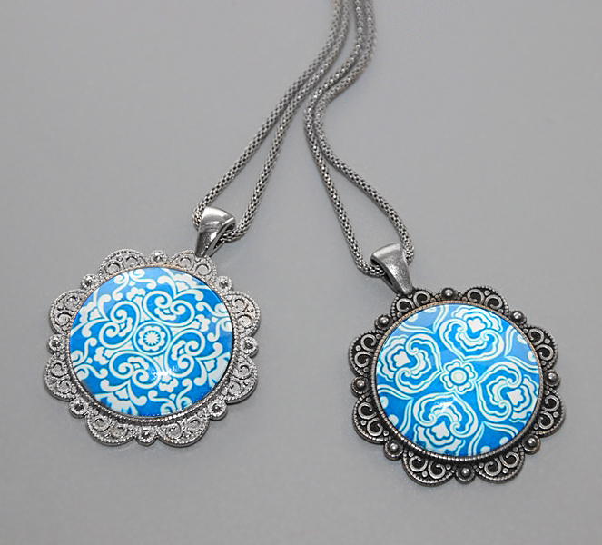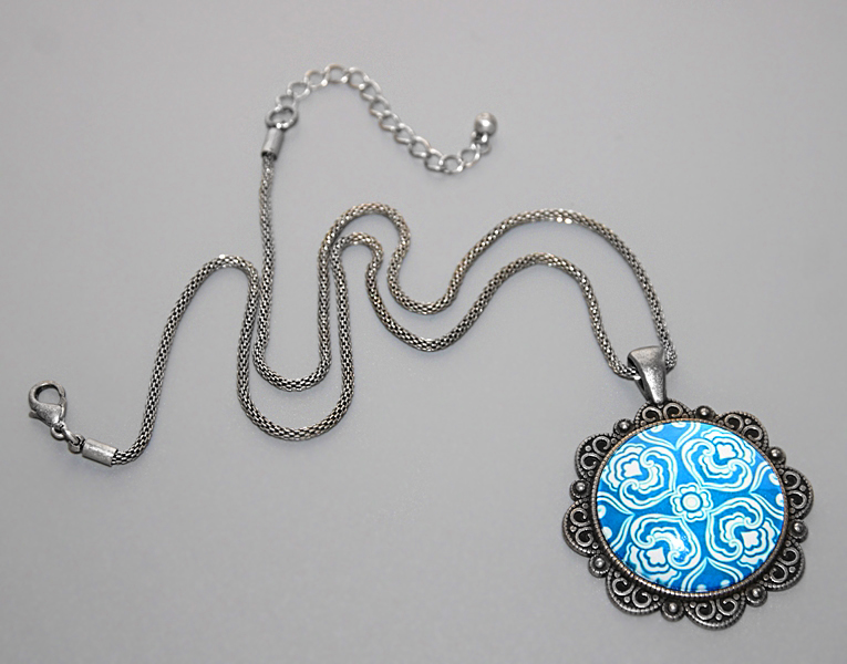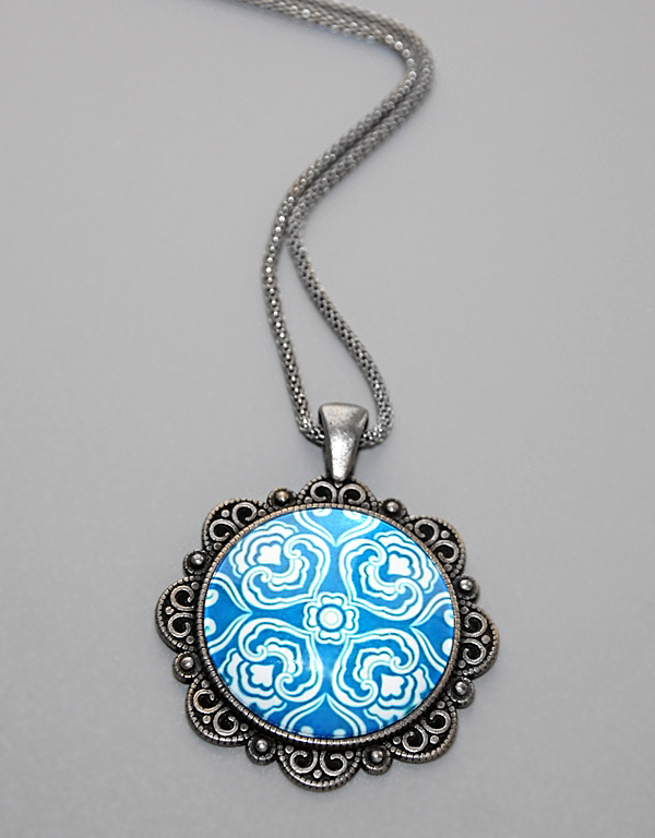 Suure rahvuslikus stiilis mustriga sinise-valgekirju klaaskamee ja tumeda vanahõbedavärvi pitsilise metallalusega lihtne kaelaehe.
