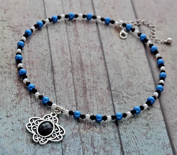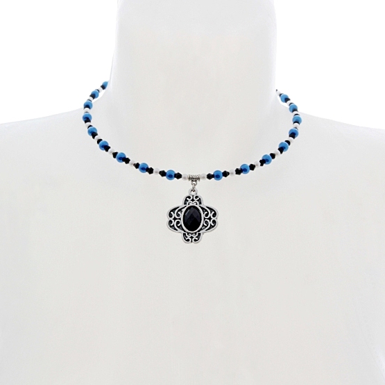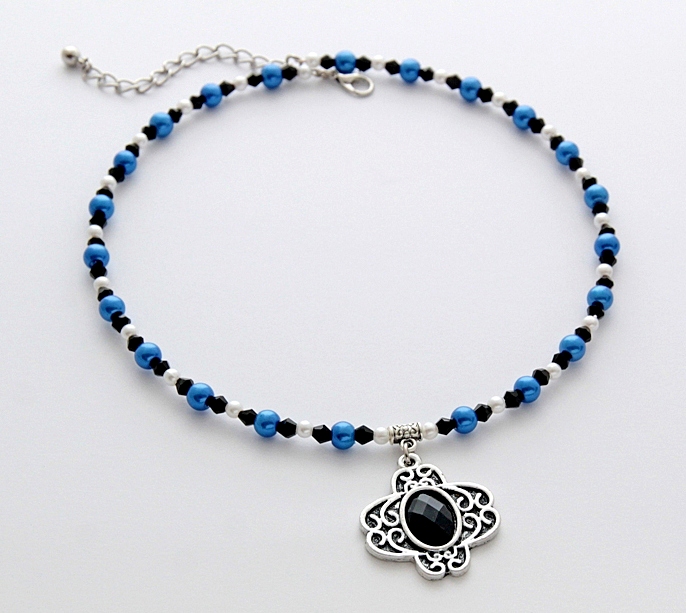 Siniste ja valgete klaaspärlite ning väikeste mustade rombikujuliste lihvitud klaashelmestega kaelavõru väikese etno stiilis metallripatsiga. Helmekee on eelpainutatud traadil ning hoiab seetõttu kenasti ümber kaela. Ilma ripatsita helmestest osa pikkus on 36 cm, karabiinkinnituse ja pikendusketi abil on võimalik kee pikkust reguleerida kuni kaelaümbermõõduni 44 cm. Antiikhõbedavärvi etno stiilis ripats on kaunistatud väikese musta värvi akrüülkameega, ripatsi mõõdud on 3 cm x 3 cm