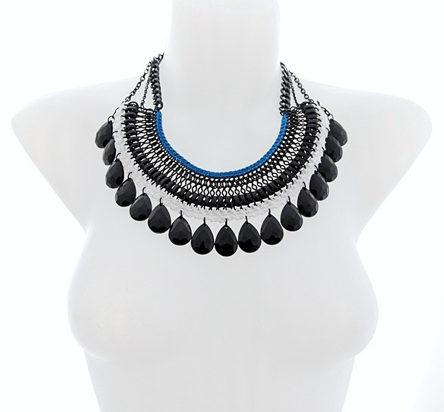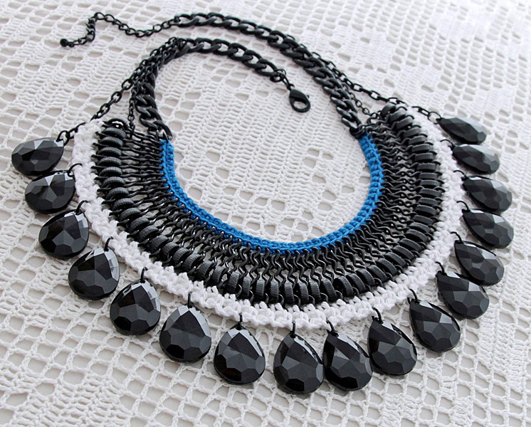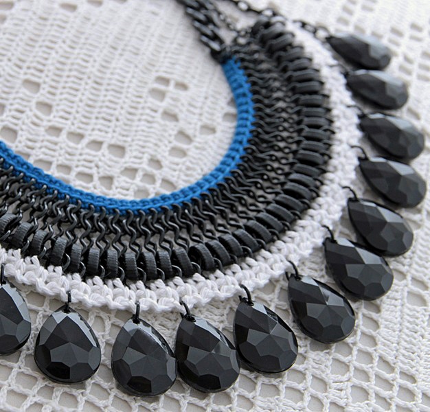 Musta värvi kettide, traadipõimingus nahkribade, valgest ja sinisest puuvillaniidist heegeldatud ääriste ning suurte tilgakujuliste akrüülripatsitega rahvuslikus stiilis suur ja efektne kaelaehe. Musta värvi ripatsite mõõdud on 18mm x 25mm. Traadipõiminguga detaili laius on 19 cm. Karabiinhaaki on võimalik kinnitada igasse ketilülisse ning kanda kaelaehet kas päris ümber kaela (choker-stiilis) või pikema dekoltee-ehtena. Maksimaalselt reguleeritav kaelaehte pikkus on 52 cm