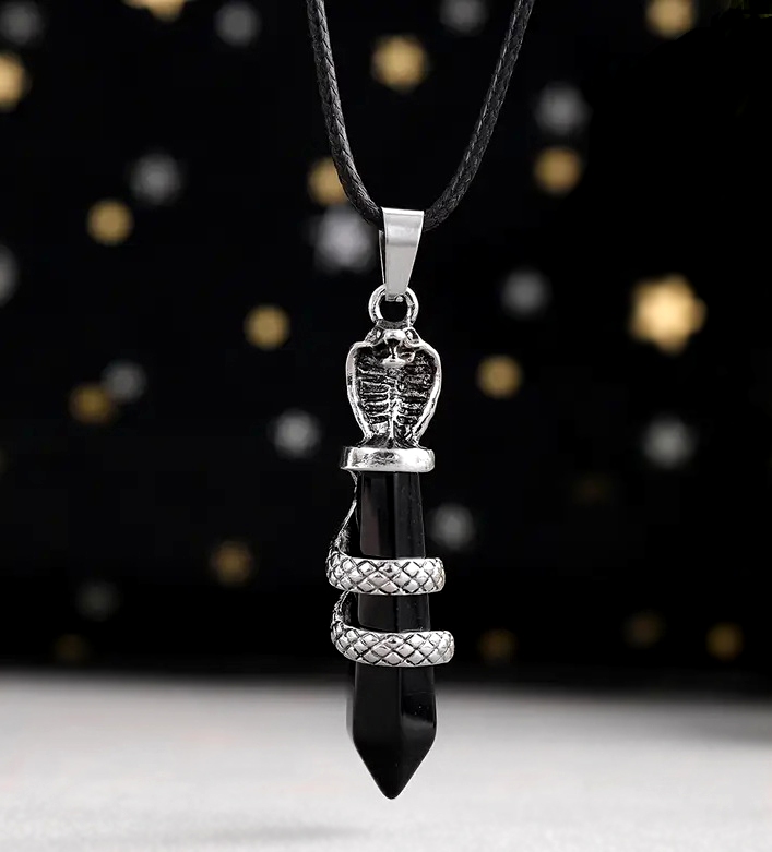 Efektse antiikhõbedavärvi kobrakujulise metallkaunistuse ja elegantse süsimusta obsidiaani kiviga ripats.