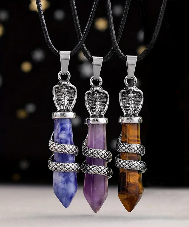 Efektse antiikhõbedavärvi kobrakujulise metallkaunistuse ja kaunilt küütleva tiigrisilmakiviga ripats.
