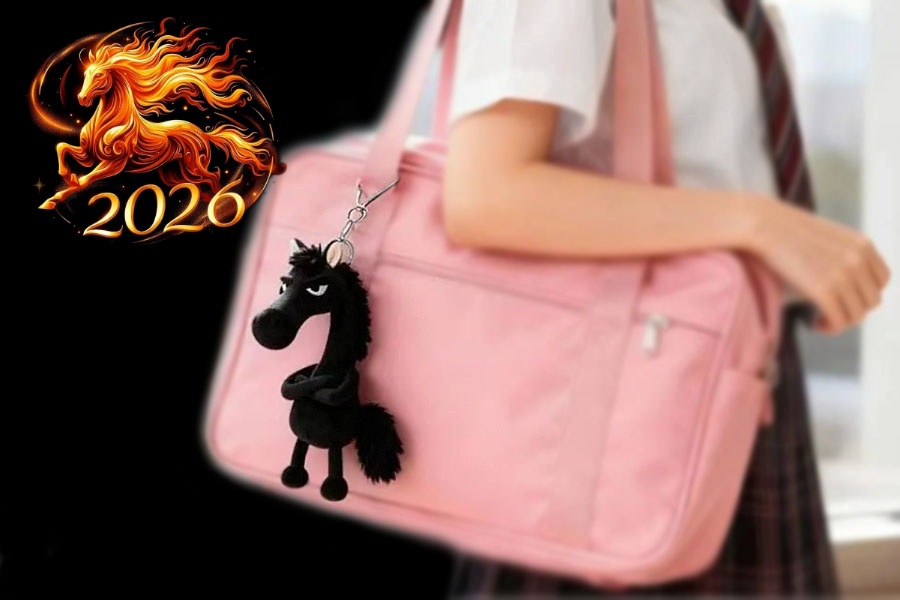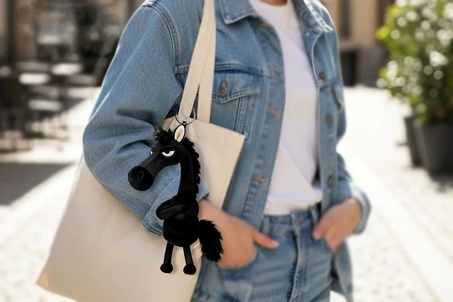“Hobuse” küljes on suuremat sorti hõbedavärvi karabiinhaak koos keti ja rõngaga, millega saab vahva ripats-hobuse kinnitada nii koti külge kui ka kasutada võtmehoidjana.