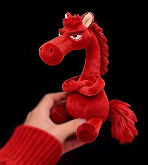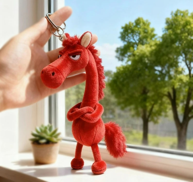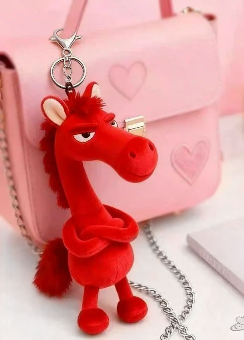 Pehmest erkpunasest plüüšist humoorikalt arrogantse välimusega hobusekujuline suur ja vahva ripats.