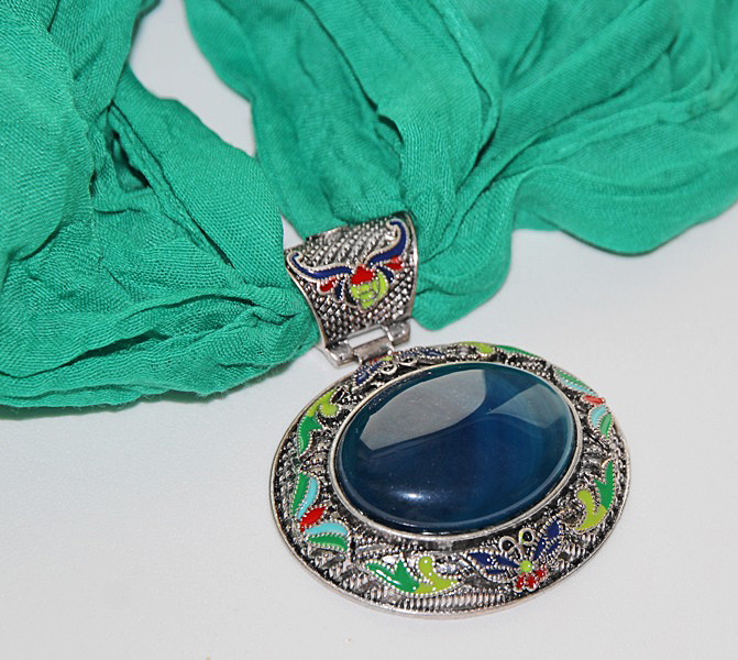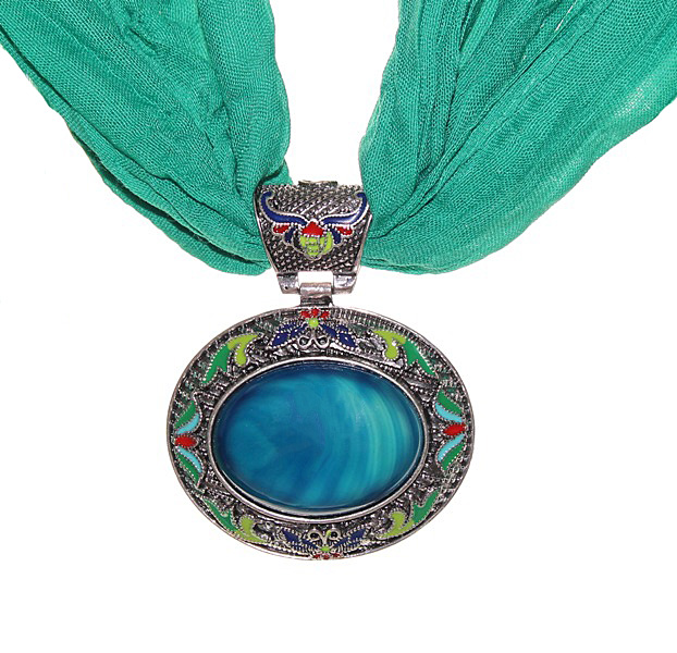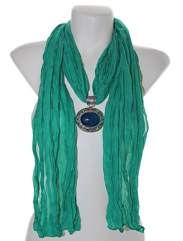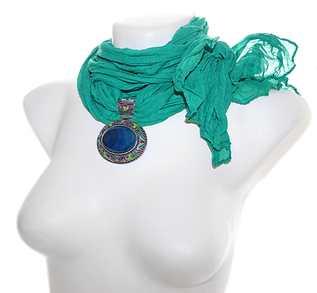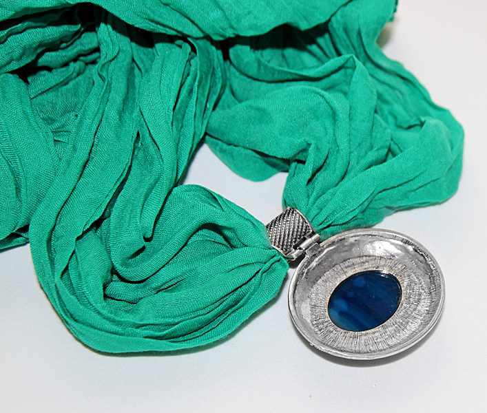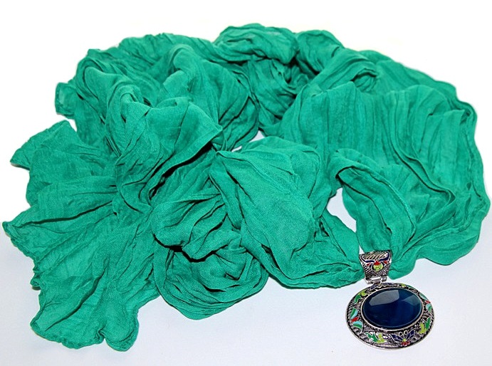 Rohelisest pehmest viskooskangast pikk sall suure sinise (kergelt läbikumava) ahhaatkivist kameeripatsiga.