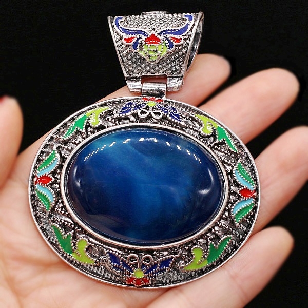 Roheline sall etnomustrilises metallraamis suure sinise ahhaatkivist kameeripatsiga