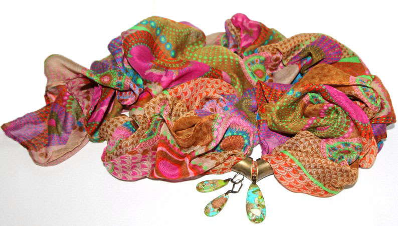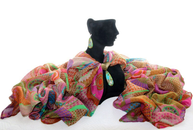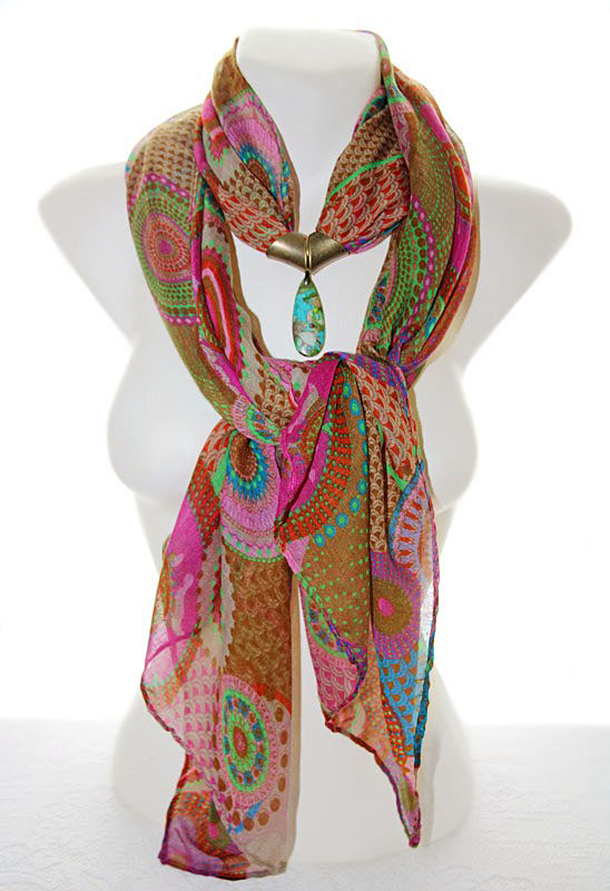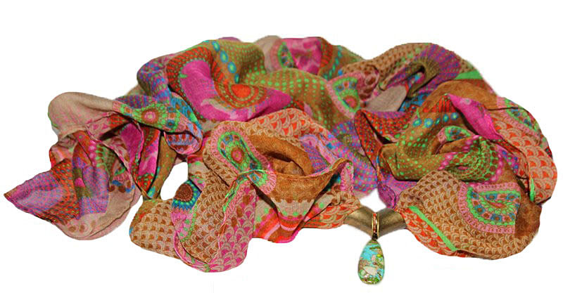 Rohelise-roosa-pruunikirju trükimustriga sall kahe pronksivärvi sallirõnga ja püriidi-jaspise segu mosaiik-kivist ripatsiga. Kahe loodusliku kivi väega ripatsi suurus on 2 cm x 5 cm. Mõnusalt pehmest viskooskangast mõõdud on 75 cm x 180 cm.