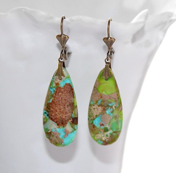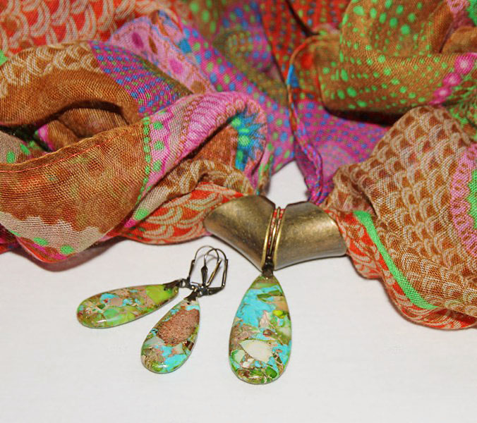 Rohelise-roosa-pruunikirju sall püriidi-jaspise mosaiikkividest ehtekomplektiga