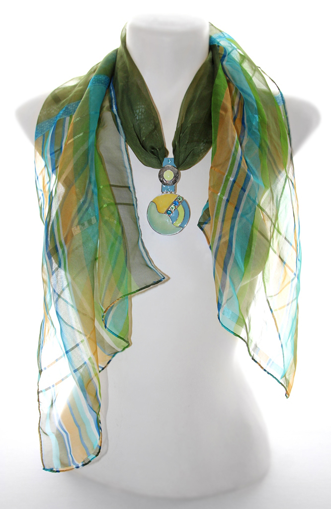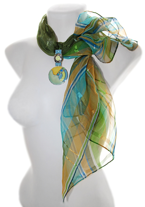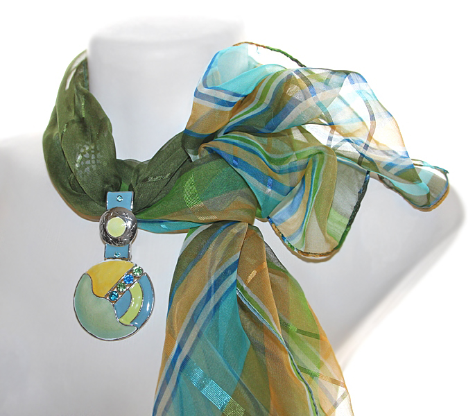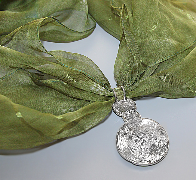 Sallikaunistuseks kasutatud ripatsi taga on kaks aasa, millest õhuke sall on läbi tõmmatud.