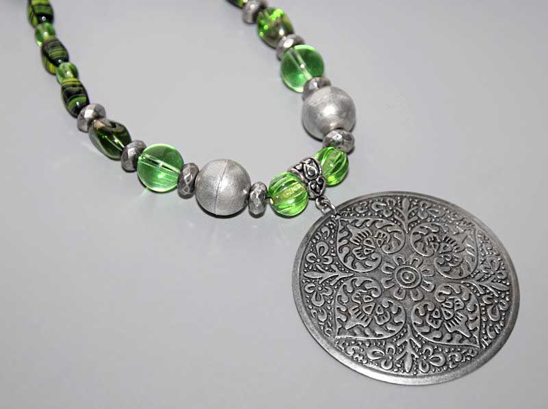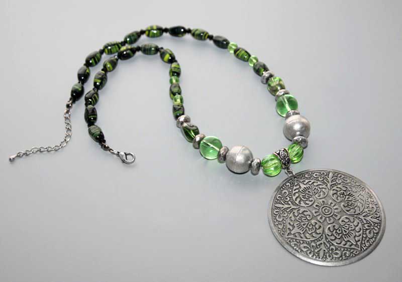Suure ümmarguse vanahõbedase metall-ripatsi ja erinevate roheliste klaashelmestega rahvuslikel ainetel kaelakee.