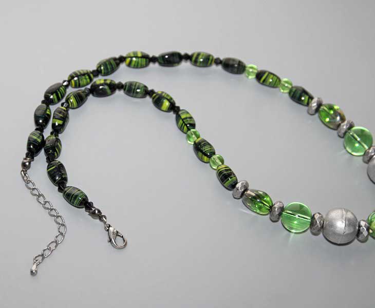 Malahhiiti meenutavate rohelisetriibuliste helmeste suurus on 6mm x 10mm, vanahõbedaste ümmarguste metallhelmeste suurus on 14mm.