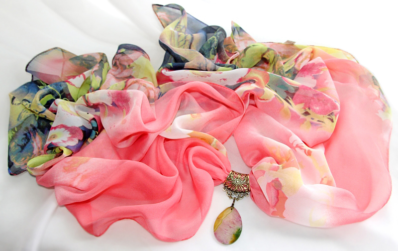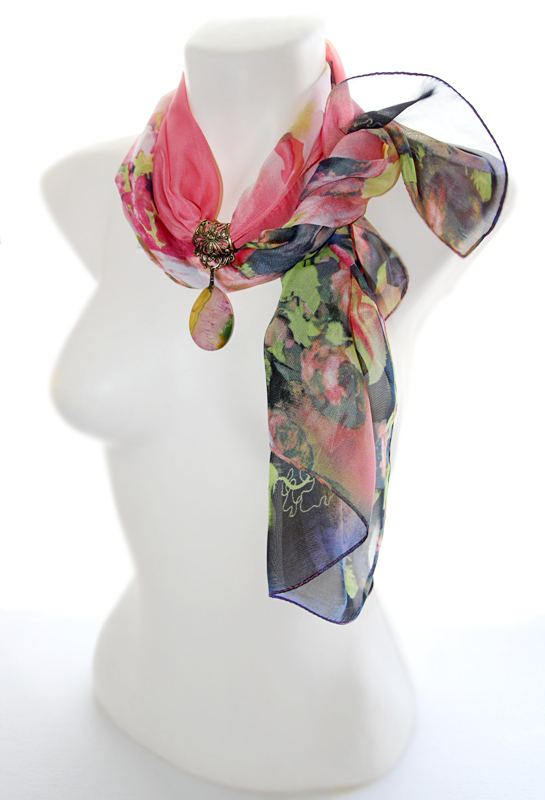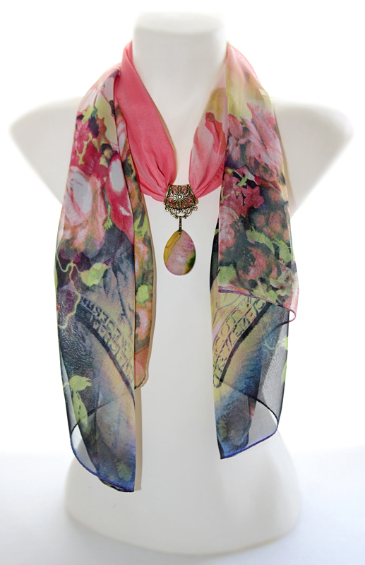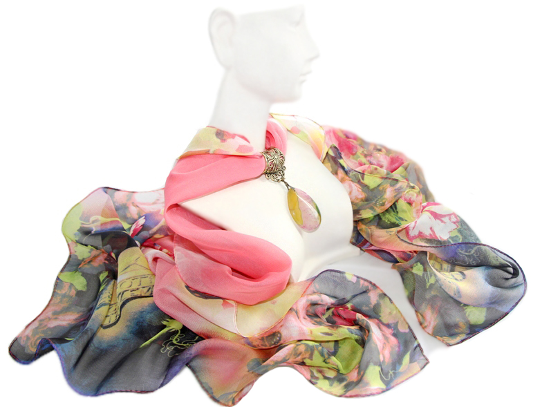 Rohelisekirjute lillemustriliste otstega roosast polüesterkangast sall antiik-kuldset värvi pitsilise sallihoidja ning kirju tilgakujulise ahhaatkivist ripatsiga. Salli värvides efektselt “mõralise” ahhaatkivist ripatsi mõõdud on 3 cm x 4,5 cm. Siidjalt pehme ja õhulise hästilangeva salli laius on 50 cm, salli pikkus on 150 cm.