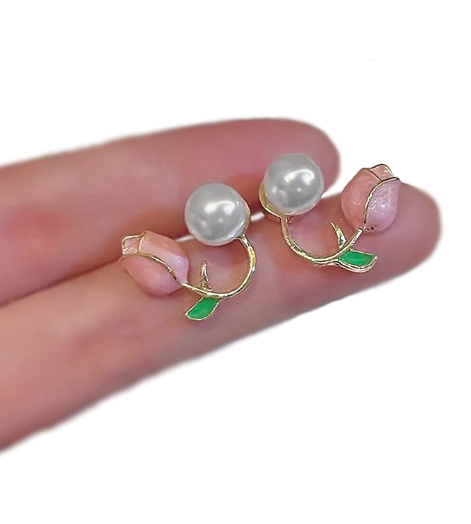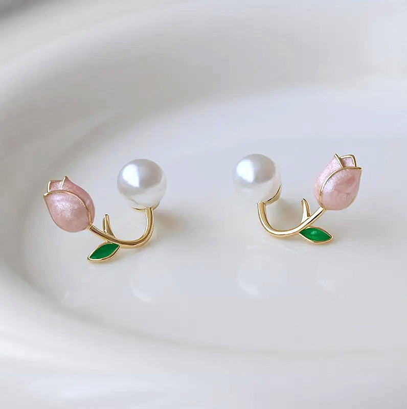 Pärlmutterläikelise roosa kristallvaiguga kaunistatud tulbikujulise metalldetaili ja valge akrüülpärliga kullavärvi kõrvaehted.