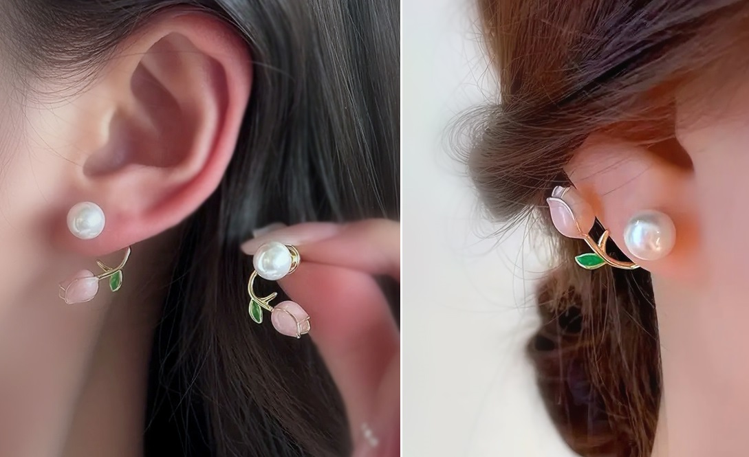 Kaarjas tulbikujuline detail kinnitub kõrva külge valgest pärlist poltkõrvarõngaga.