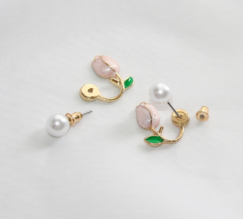 Komplekti kuulub kaks pärliga poltkõrvarõngast ja kaks tulbimotiiviga kullavärvi metalldetaili ning üks paar kullavärvi kinnitustaguseid.