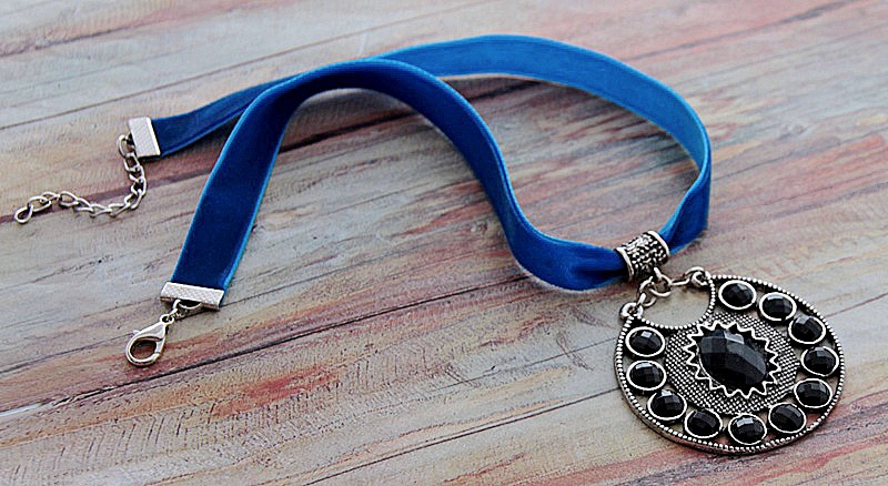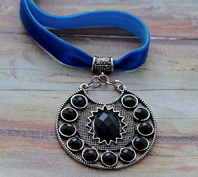 Suure antiikhõbedavärvi rahvuslikus stiilis ümmarguse metallripatsi ja sinise sametpaelaga choker (ümber kaela) kaelaehe. Kaelaehte pikkus on reguleeritav 39 cm-st kuni 43 cm-ni. Ümmarguse ripatsi detail on kaunistatud mustade akrüülkameedega, ripatsi suurus on 5 cm