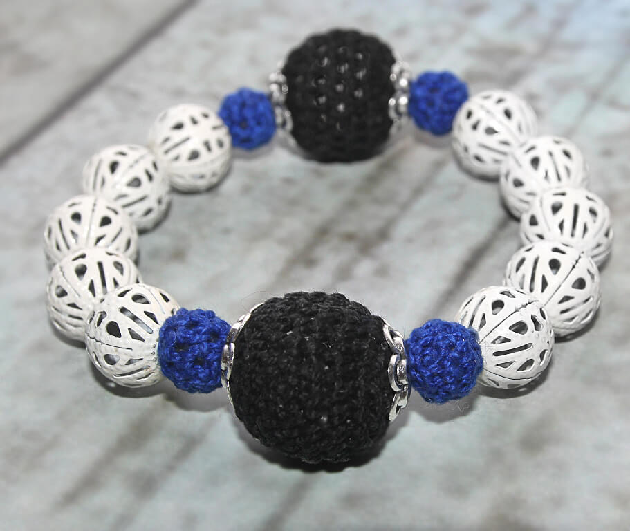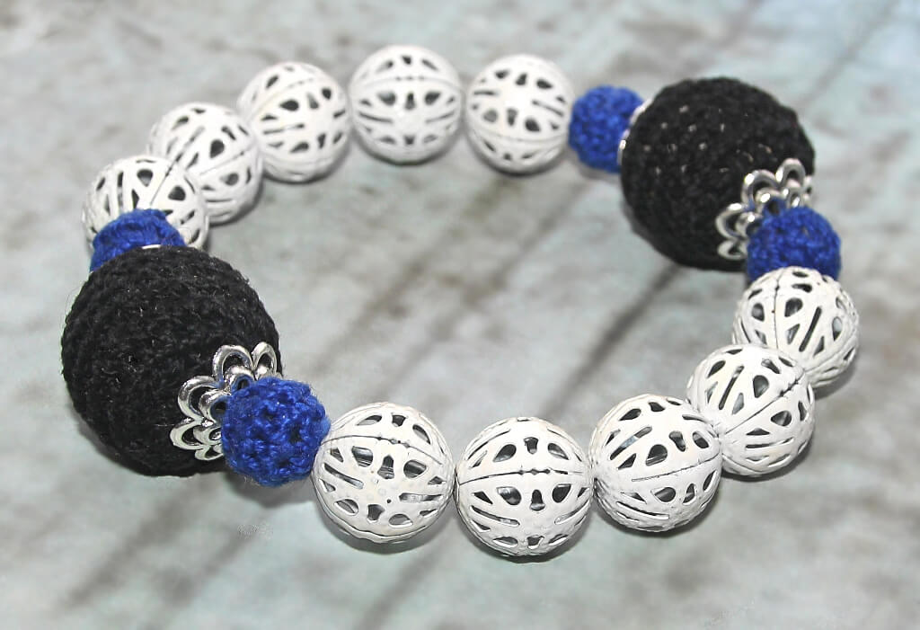 Kahe suure musta, väikeste siniste heegeldatud helmeste ja valgeks värvitud metallist pitspallidega käevõru on elastik-kummiga, mida on mugav käele rullida.