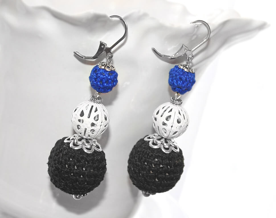 Suurte mustade (diameetriga 22mm) heegeldatud helmeste sees on puidust helmed, väikesed sinised on heegeldatud ümber läbipaistva akrüülhelme.