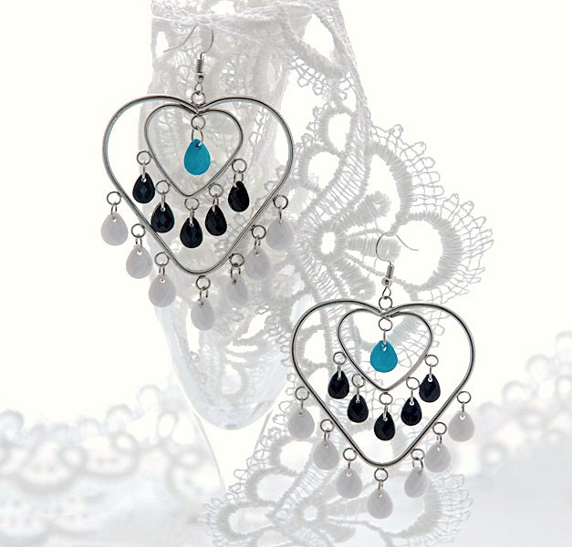 Hõbedavärvi südamekujulise metallraami ja sini-must-valgete tilkadega kõrvarõngad