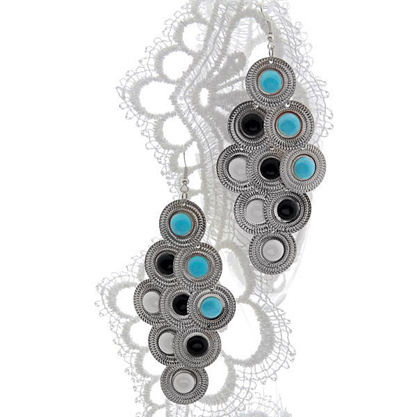 Õhukeste hõbedavärvi ümmarguste metallripatsitega pikad kõrvarõngad. Kõrvarõngaste detailid on kaunistatud siniste, mustade ja valgete ümmarguste akrüülist kameedega. Kõrvarõngaste pikkus koos hõbedavärvi konksuga on 9 cm.