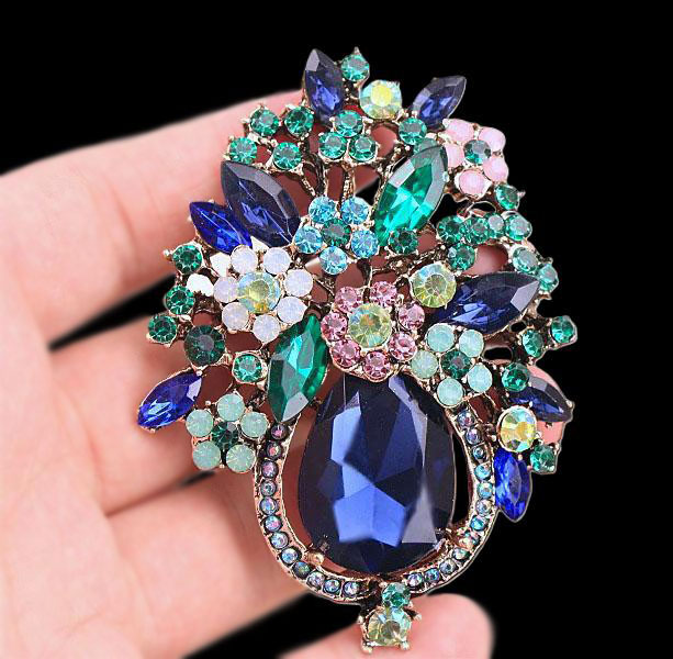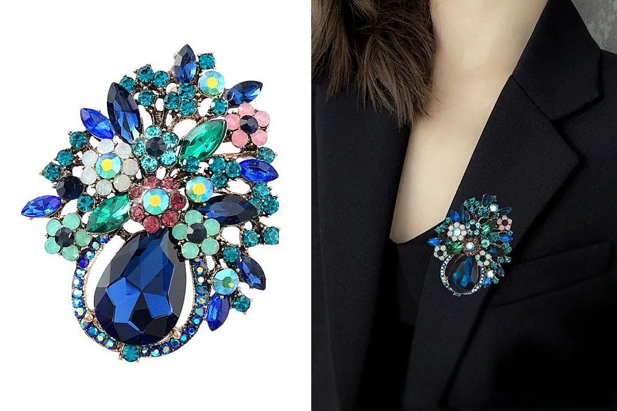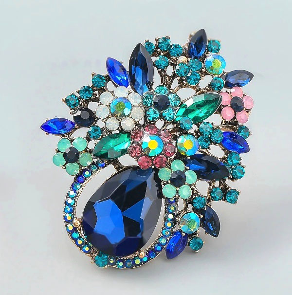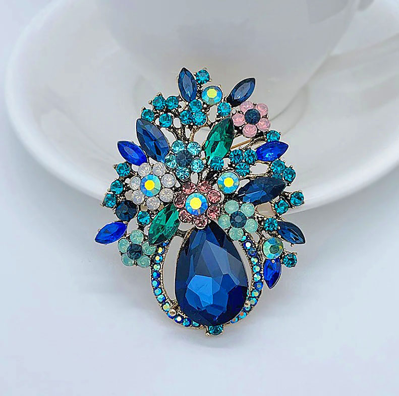 Erineva suuruse ja kujuga värvilistest klaaskristallidest lillekimbumotiiviga pross suure ja särava, sügavsinise tilgakujulise kaunistusdetailigaga.