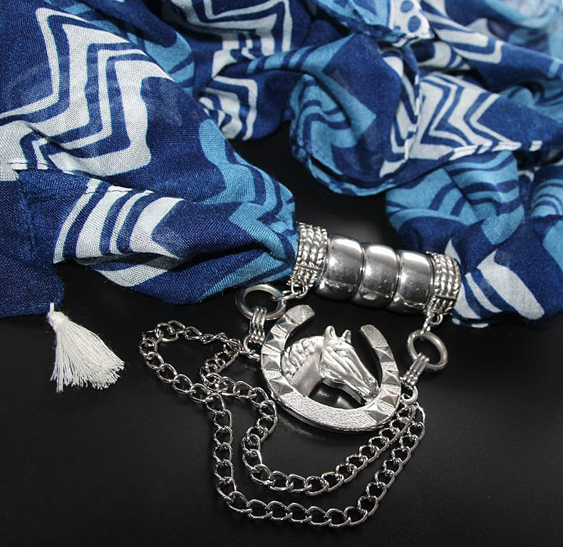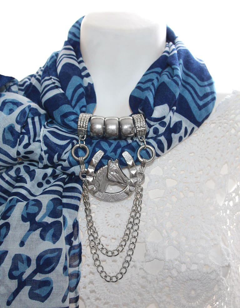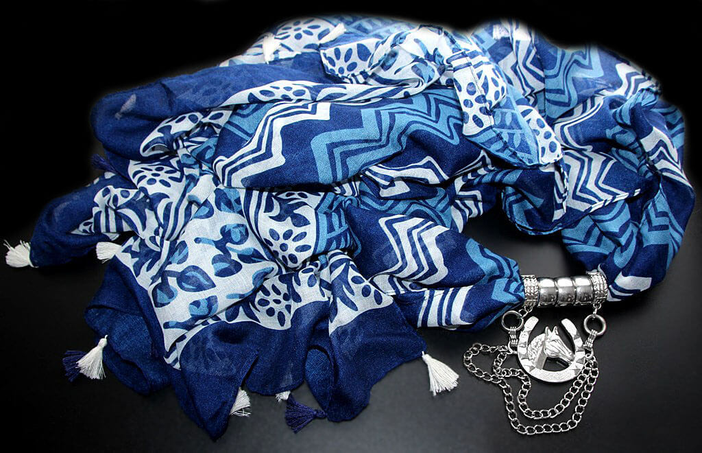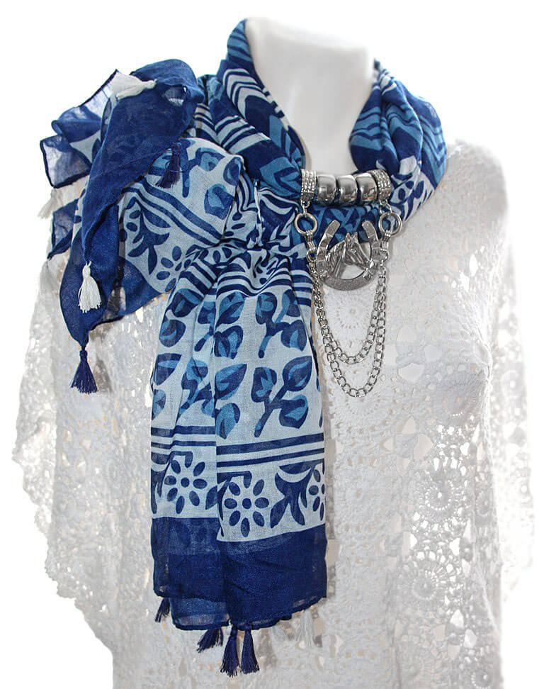 Sinise-valgekirjust viskooskangast väikeste tutikestega sall kaunistusrõngaste ja suure hobuserauakujulise hõbedase metallripatsiga.