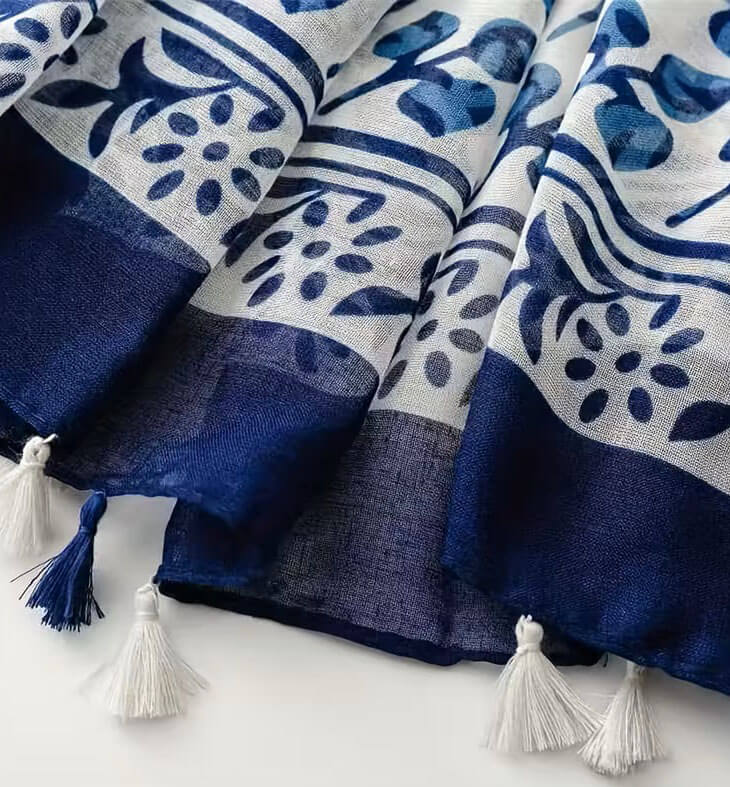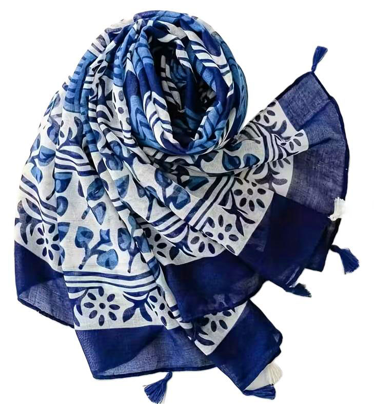 Sinise-valgekirju, rahvuslikus stiilis mustrilise salli pikkus (ilma tutikesteta) on 180 cm ja laius 80 cm, siniste ja valgete tutikeste pikkus on 2,5.
