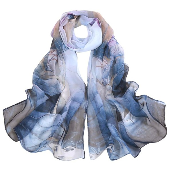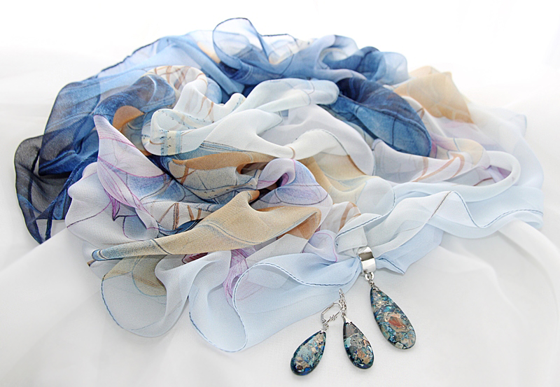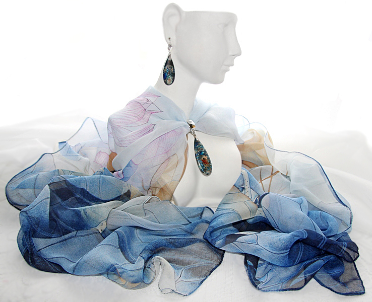 Sinistes-beežides toonides vesiroosimustriline õhuline sall hõbedavärvi väikese sallirõnga ja püriidi-jaspise segu mosaiik-kivist ripatsiga. Kahe loodusliku kivi väega ripatsi suurus on 2 cm x 5 cm. Siidiselt pehmest ja hästilangevast polüesterkangast salli mõõdud on 50 cm x 150 cm.