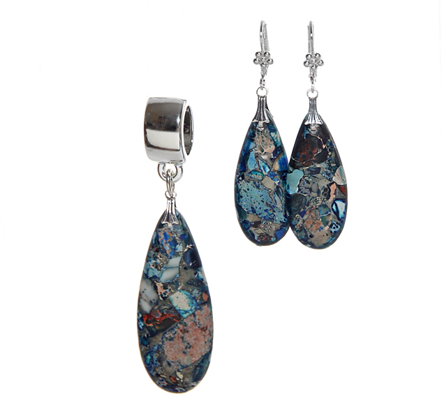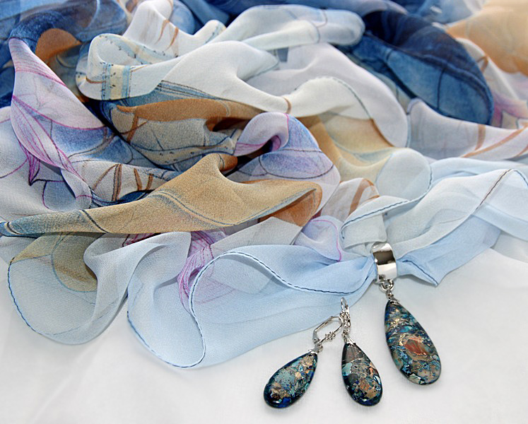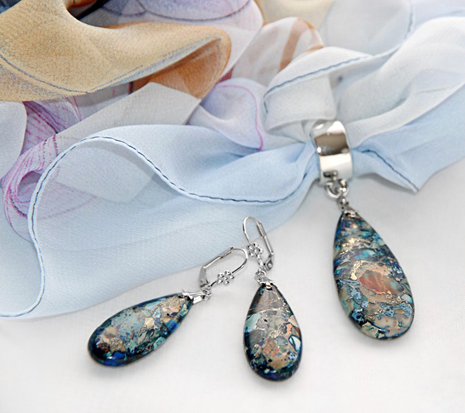 Sinise-beežikirju sall püriidi-jaspise mosaiikkividest ehtekomplektiga