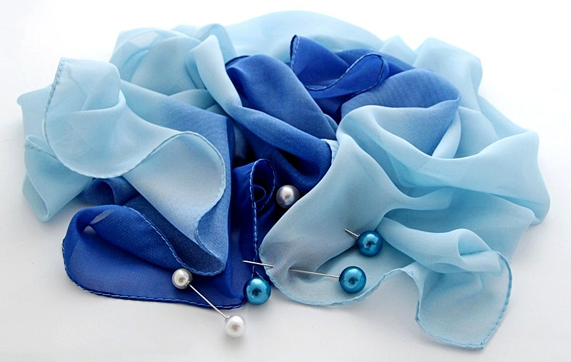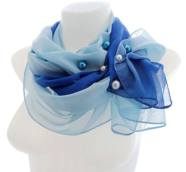 Sulanduvates sinistes toonides polüesterkangast sall kolme pärlitest kaunistusnõelaga. Õhulise ja hästilangeva salli mõõdud on 50 cm x 150 cm.