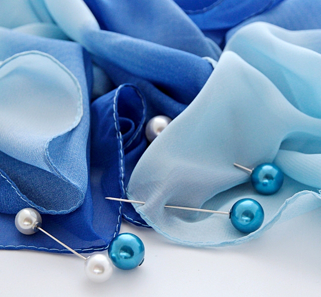 Sulanduvates sinistes toonides sall kolme pärlitest kaunistusnõelaga