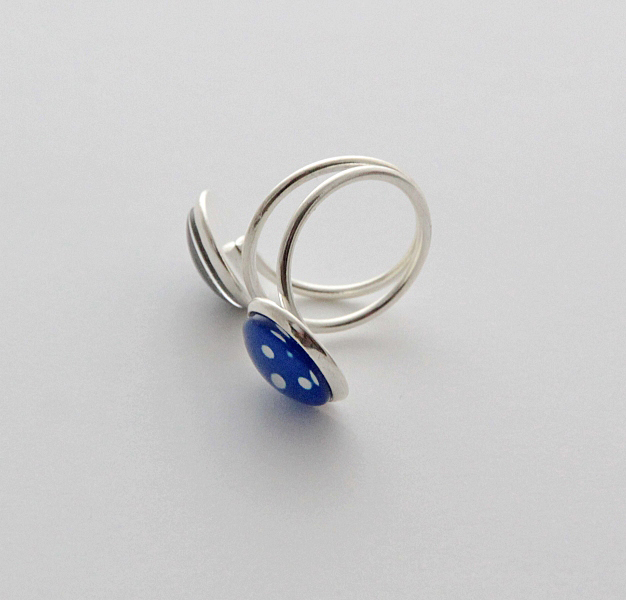Efektne kahe hõbedavärvi alusega sõrmus sinise ja musta valgetäpilise klaaskameega. Väikeste ümmarguste kameede läbimõõt on 12 mm. Sõrmuse spiraal on kvaliteetsest kroomitud allergiavabast metallist ning seda on võimalik painutada suurusele sobivaks. Samuti on võimalik detaile üksteisest lähemale või kaugemale painutada
