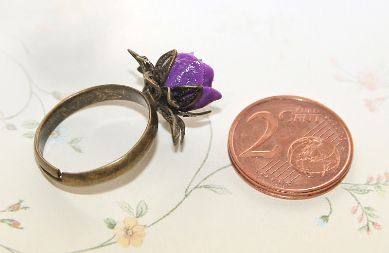 Õielehti meenutava mitmekihilise pitsilise pronksivärvi alusraami ja väikese kunstvaigust lilla roosiga väike sõrmus.