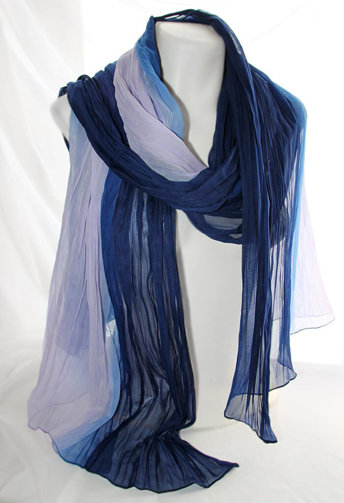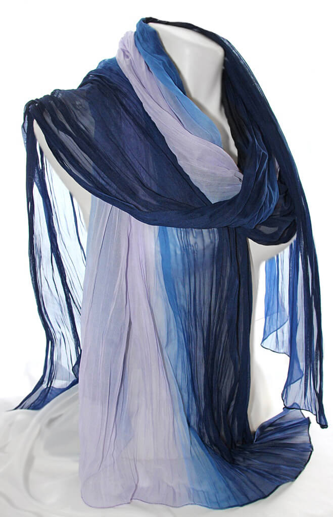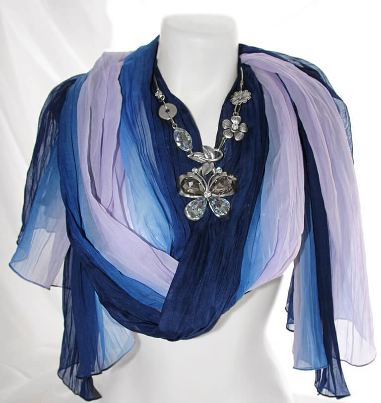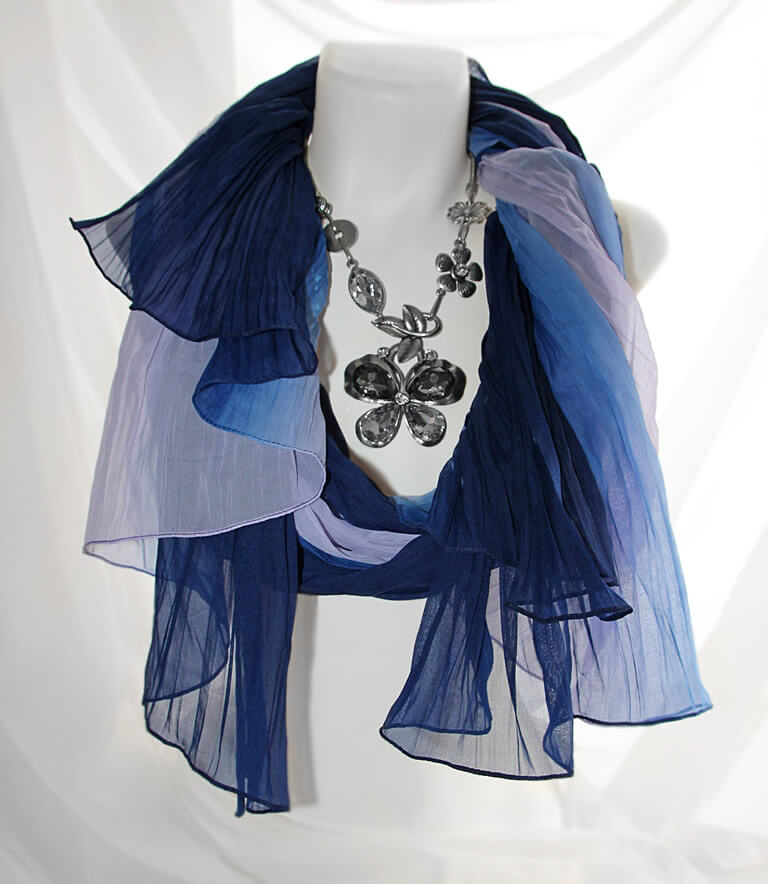 Sulanduvates sinistes ja sirelilillades toonides õhulisest polüesterkangast suuremat sorti sall särava antiikhõbedase vintage kaelaehtega.