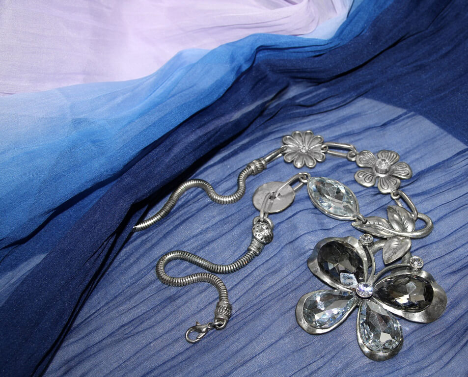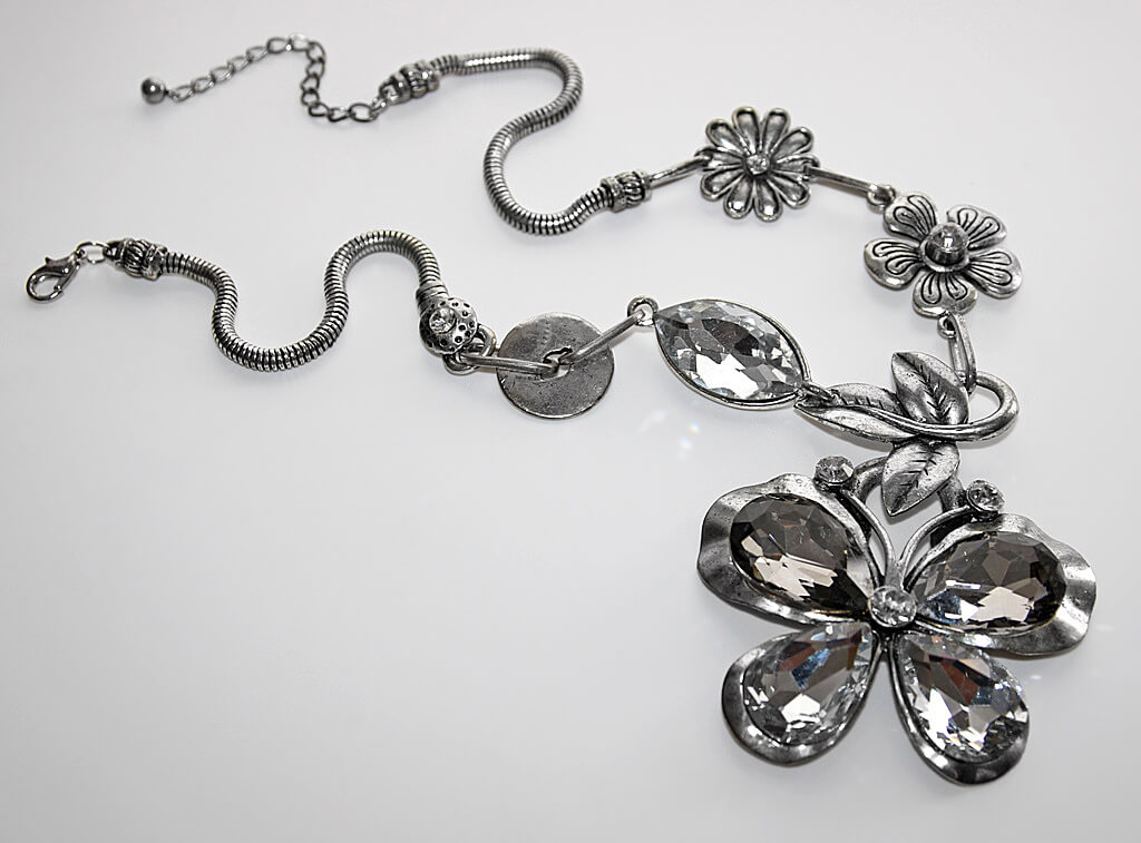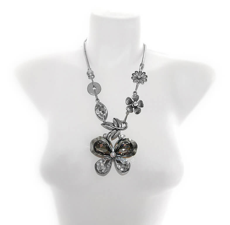 Suurte ja säravate klaaskristallidega kaunistatud lille- ja liblikamotiidega metalldetailidest kaelakee on üsna “kaalukas”. Keskmise (liblika)motiivi mõõdud on 7 cm x 7 cm.