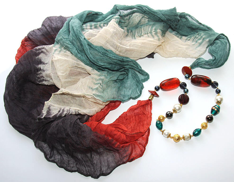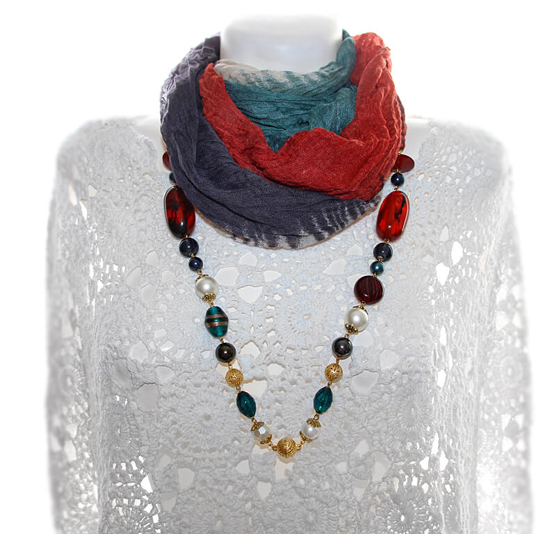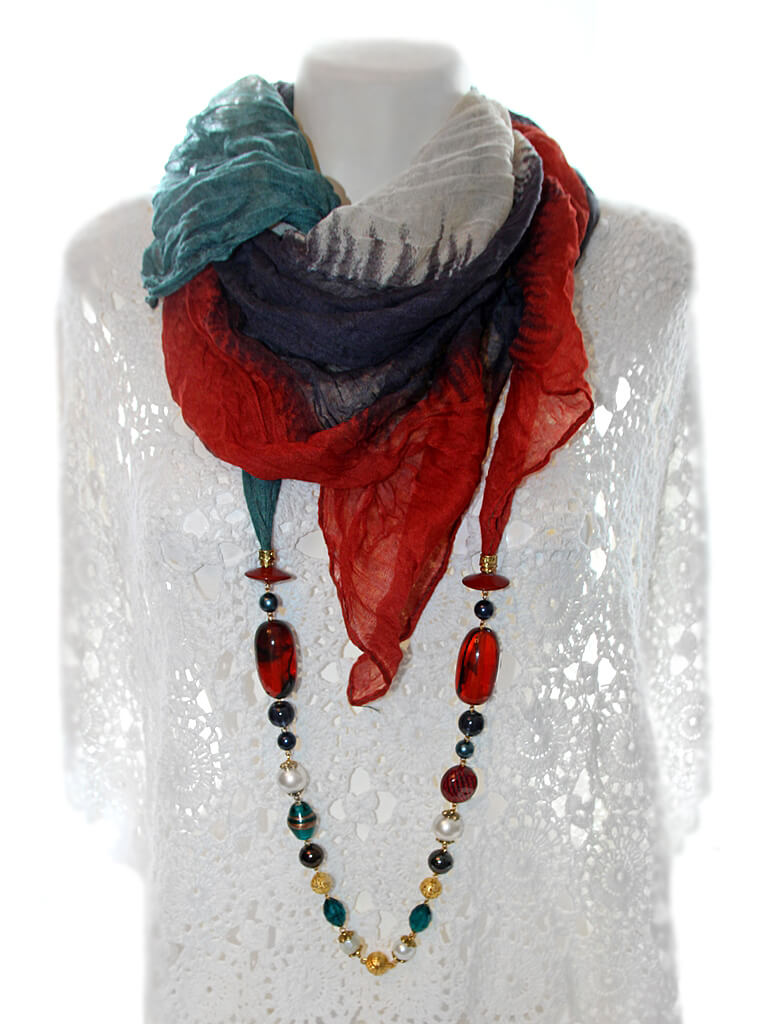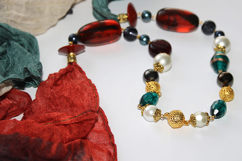 Sulanduvates rohelise-helebeeži-tumehalli ja terrakotavärvides rõngas-sall kullavärvi kaunistusdetailide ja salli värvides erinevatest akrüül- ja klaashelmestest keega.