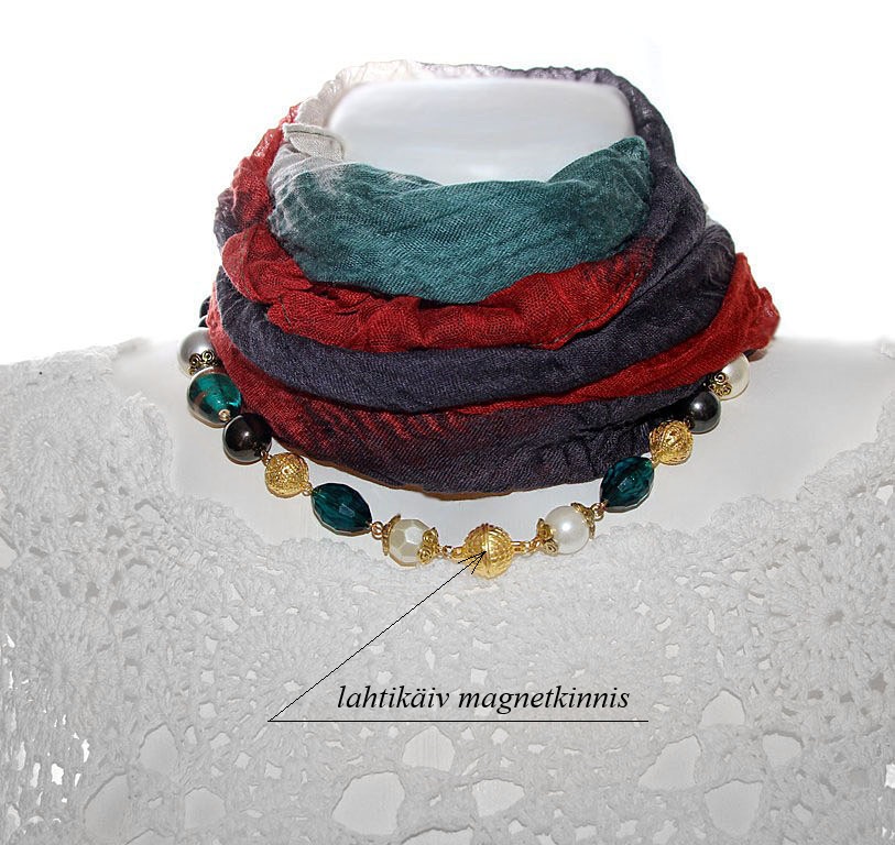 Helmekee keskel on lahtikäiv magnetkinnis, mistõttu saab salli ka mugavalt ja mitmekihiliselt ümber kaela mässida.