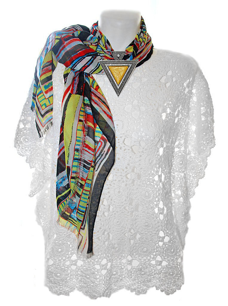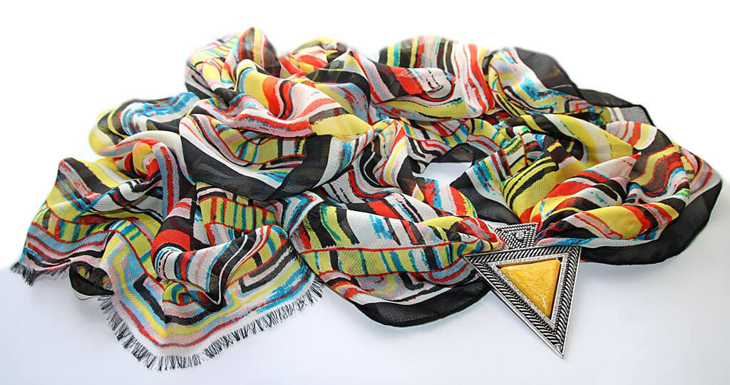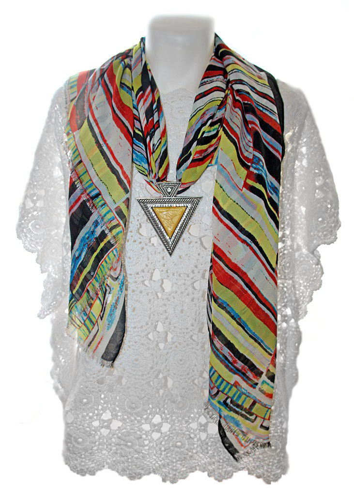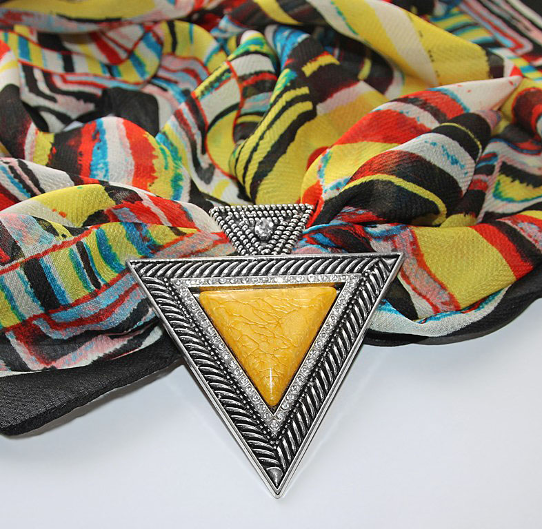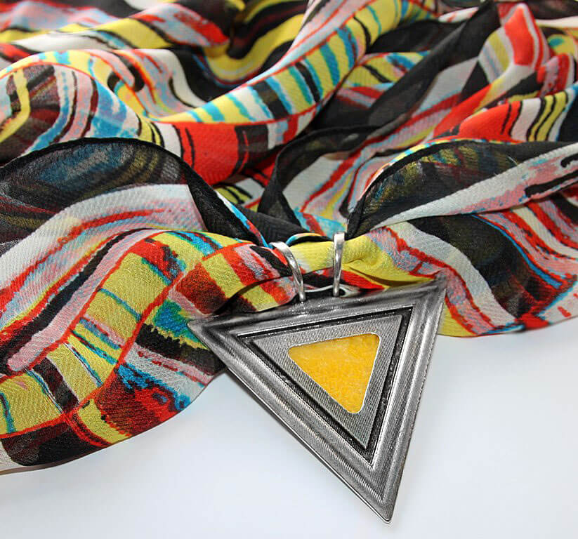 Rahvuslikel ainetel triibumustrilisest polüesterkangast sall-kaelaehe suure kolmnurkse metallripatsiga. Antiikhõbedavärvi metallripatsi keskel on reljeefne kollane kristallvaigust südamik, ääred kaunistatud säravate läbipaistvate klaaskristallidega.