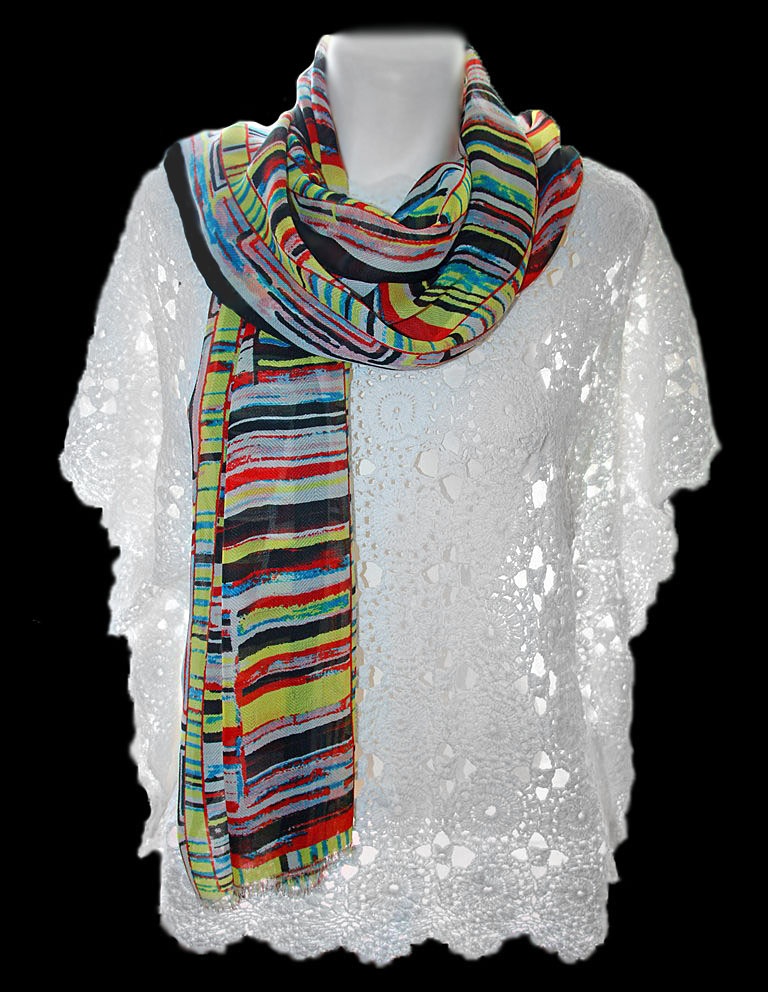 Pool-läbipaistva, õhulise ja hästilangeva salli otsad on narmastatud, salli mõõdud on 46 cm x 150 cm.