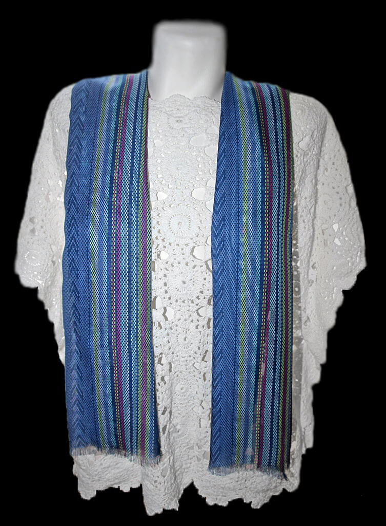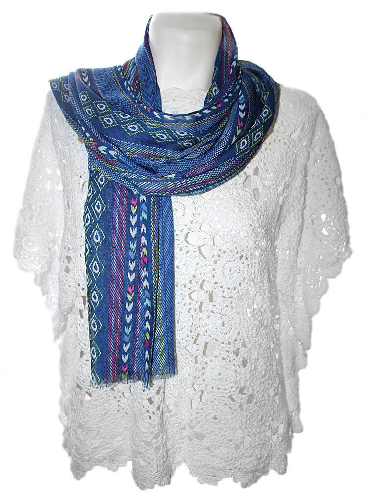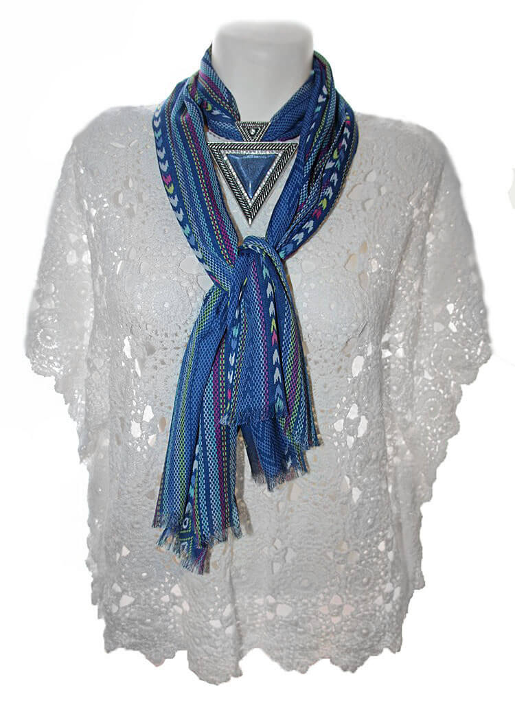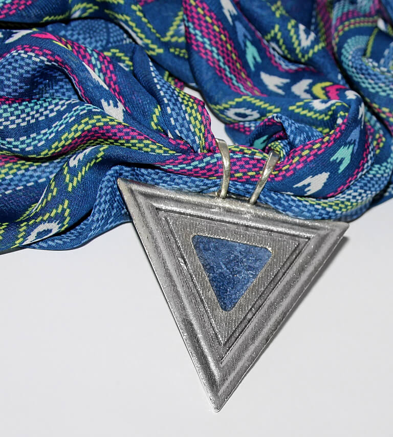 Rahvuslikel ainetel triibumustrilisest sinistes toonides polüesterkangast sall-kaelaehe suure kolmnurkse metallripatsiga. Antiikhõbedavärvi metallripatsi keskel on reljeefne sinine kristallvaigust südamik, ääred kaunistatud säravate läbipaistvate klaaskristallidega.
