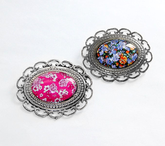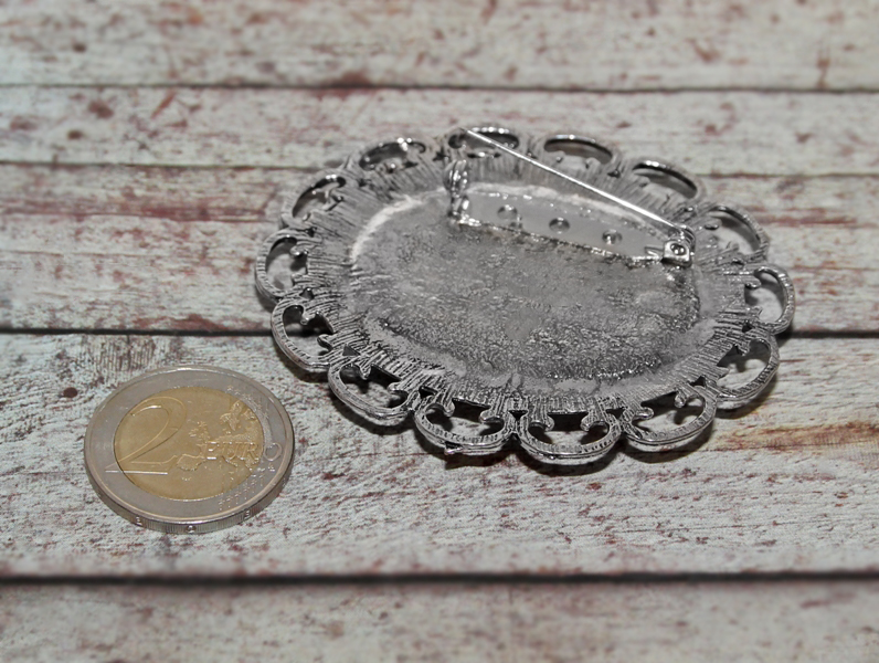 Vanahõbedavärvi pitsilises metallraamis suure klaaskameega rahvuslikel ainetel pross. Kaunite võõrasemamotiividega lillemustrilise kamee mõõdud on 3 cm x 4 cm, prossi mõõdud koos raamiga on 6 cm x 7 cm.