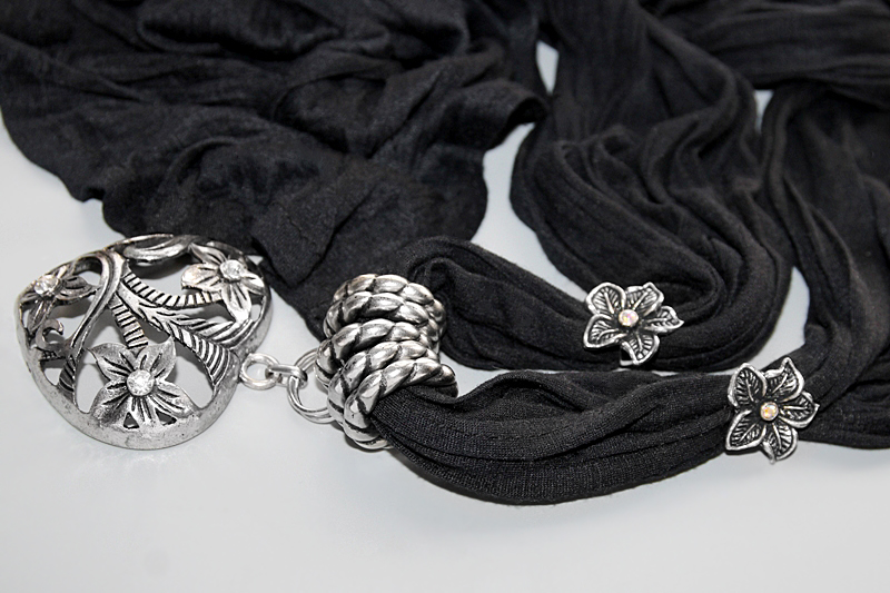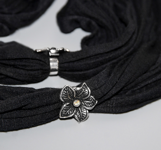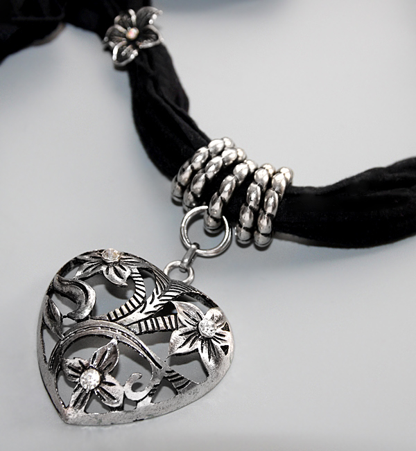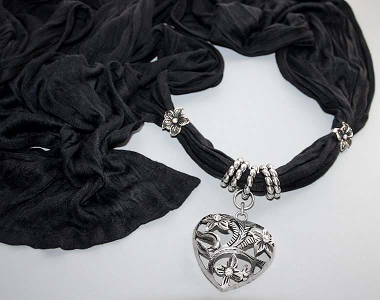 Mustast puuvilla ja viskoosisegu trikotaažist pikk sall antiikhõbedavärvi kaunistusdetailide ja suure südamekujulise metallripatsiga.