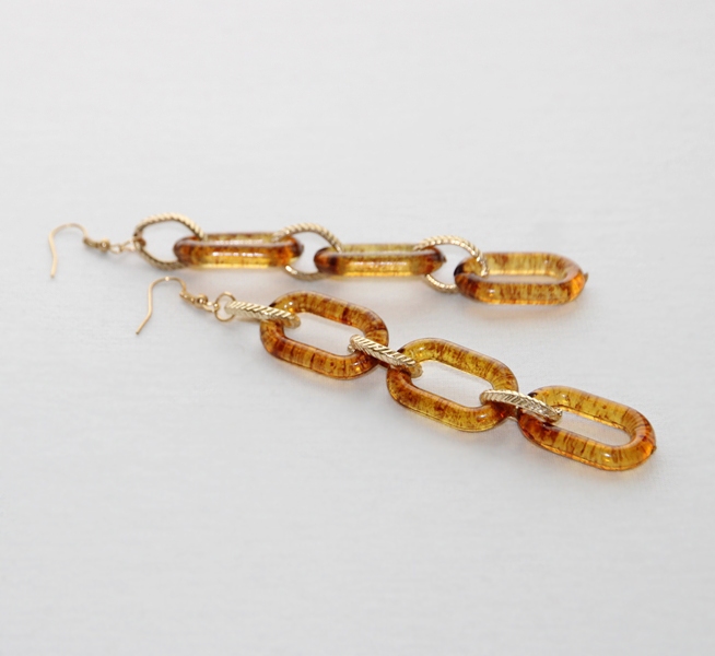 Kullavärvi vaherõngaste ja suurte kollakaspruunide läbipaistvate akrüülist lülidega pikad kõrvarõngad.
